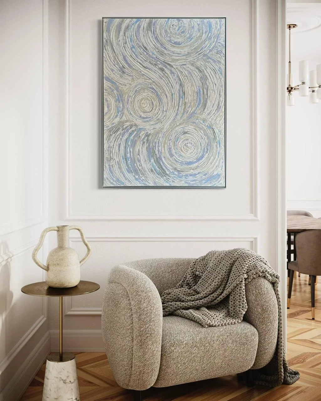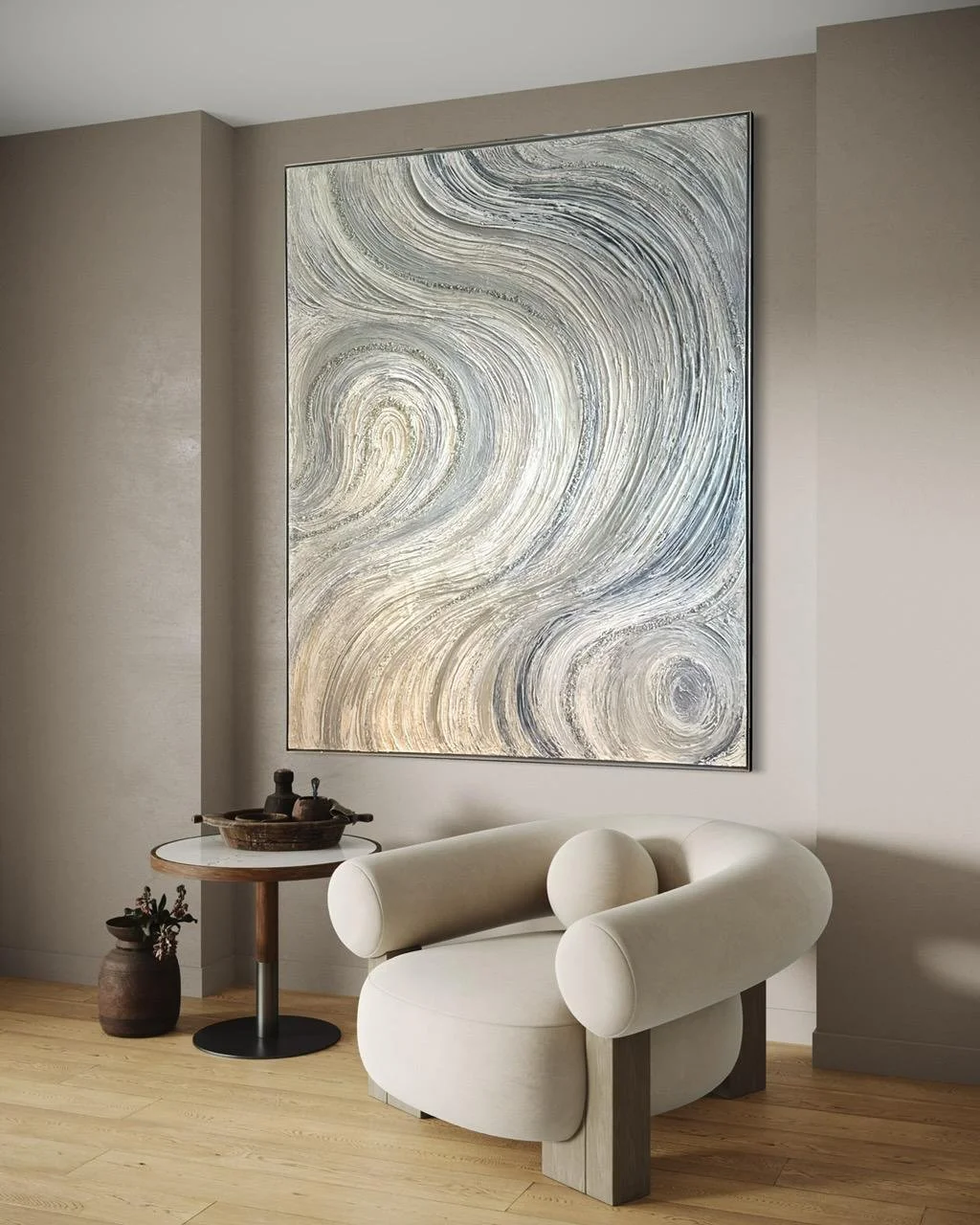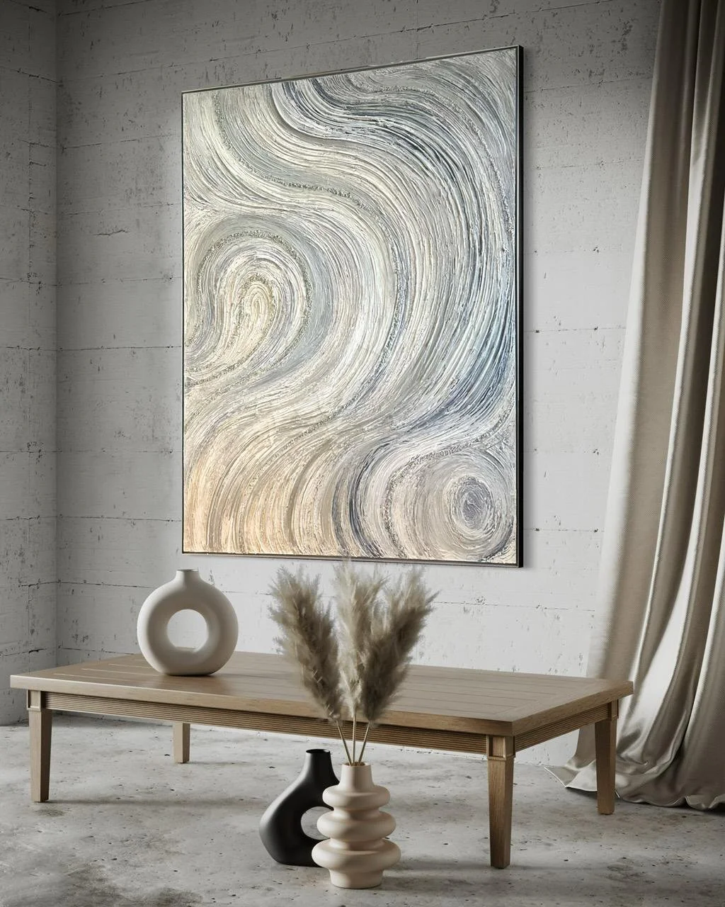 This sophisticated mixed media canvas titled "50 Shades of Grey" measures 48x60 inches and is elegantly framed in silver. Its nuanced textures and subtle tones create a captivating depth that complements modern interiors, making it a refined centerpiece for any space seeking understated elegance.