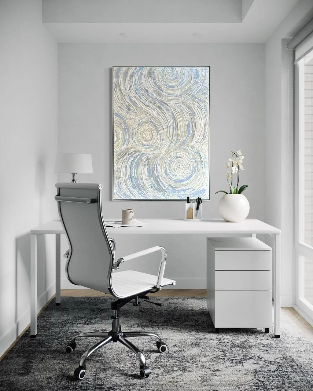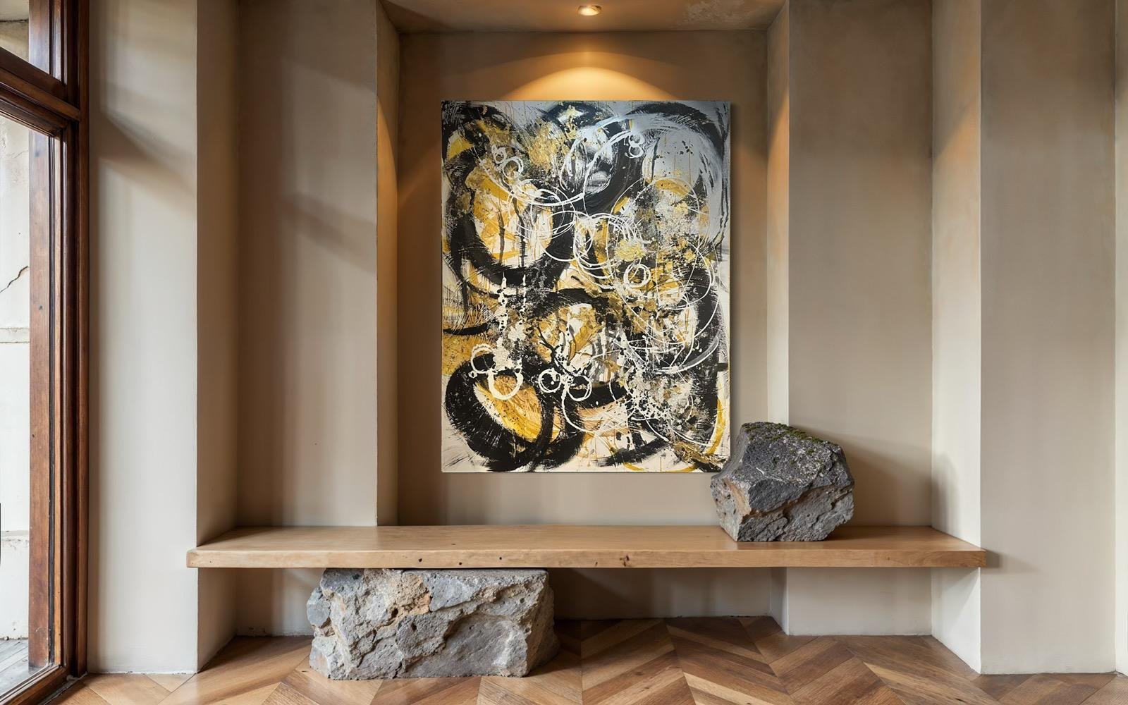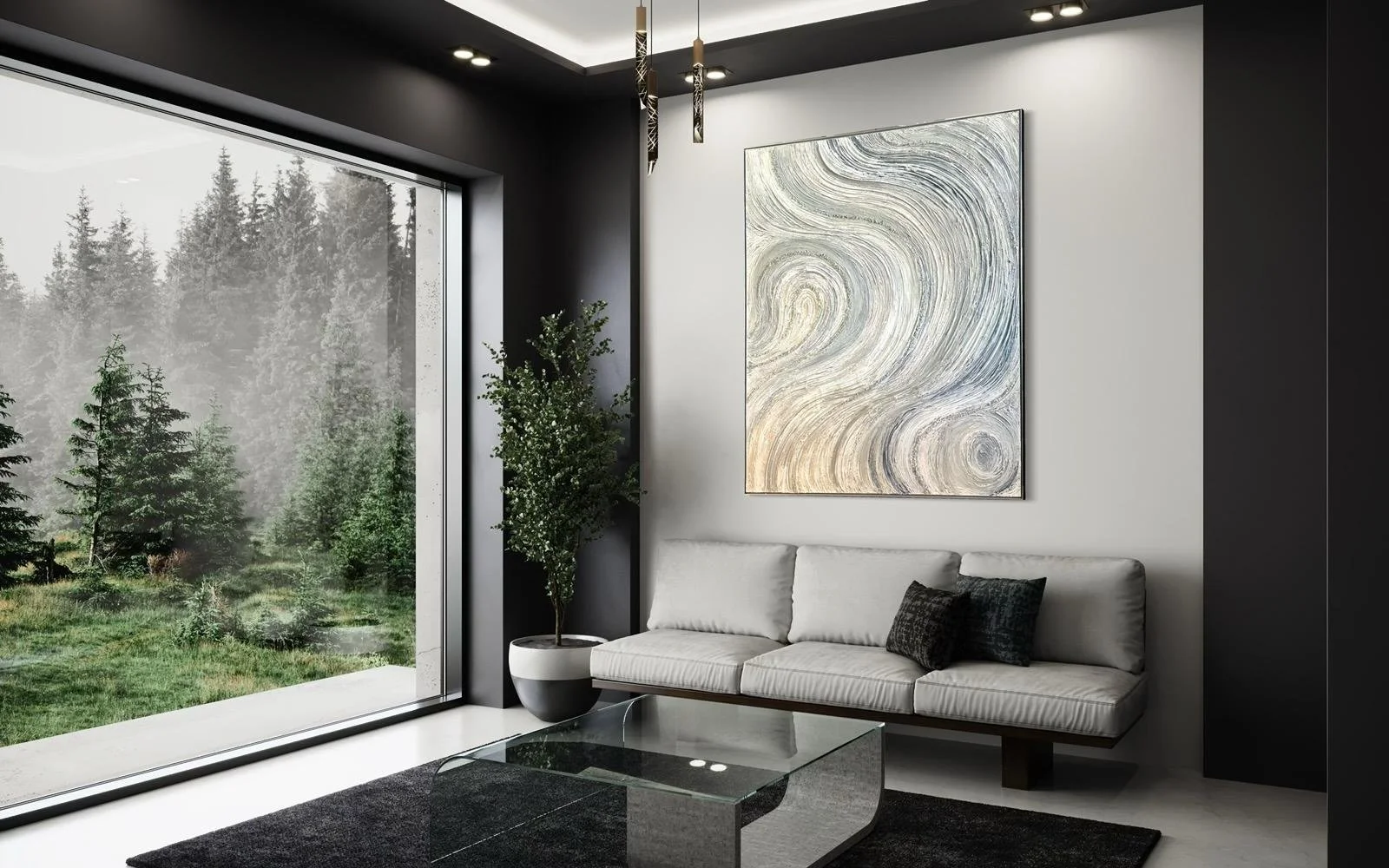 This sophisticated mixed media canvas titled "50 Shades of Grey" measures 48x60 inches and is elegantly framed in silver. Its nuanced textures and subtle tones create a captivating depth that complements modern interiors, making it a refined centerpiece for any space seeking understated elegance.