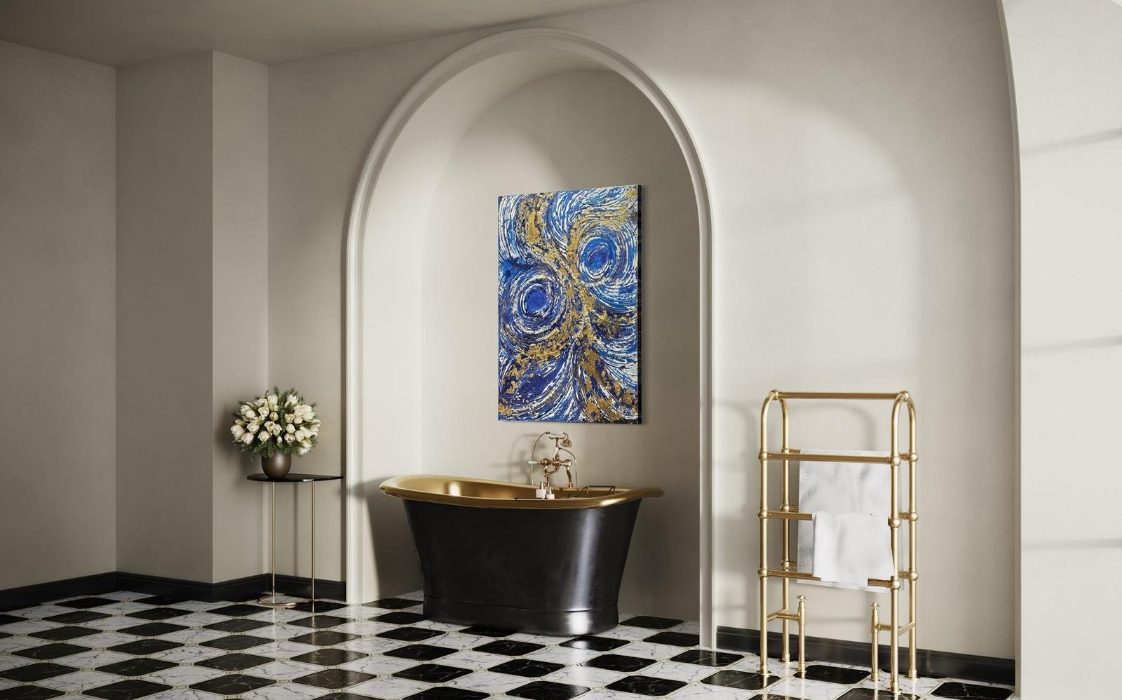 This 30x40 inch mixed media canvas, titled Ultimate Dreams, artfully blends blue and gold tones to create a refined visual experience. The piece’s layered textures and harmonious color palette evoke a sense of depth and elegance, making it a captivating centerpiece for any sophisticated space.